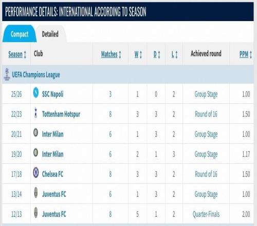 孔蒂歐冠帶隊戰績:45場16勝14平15負,勝率35.6%